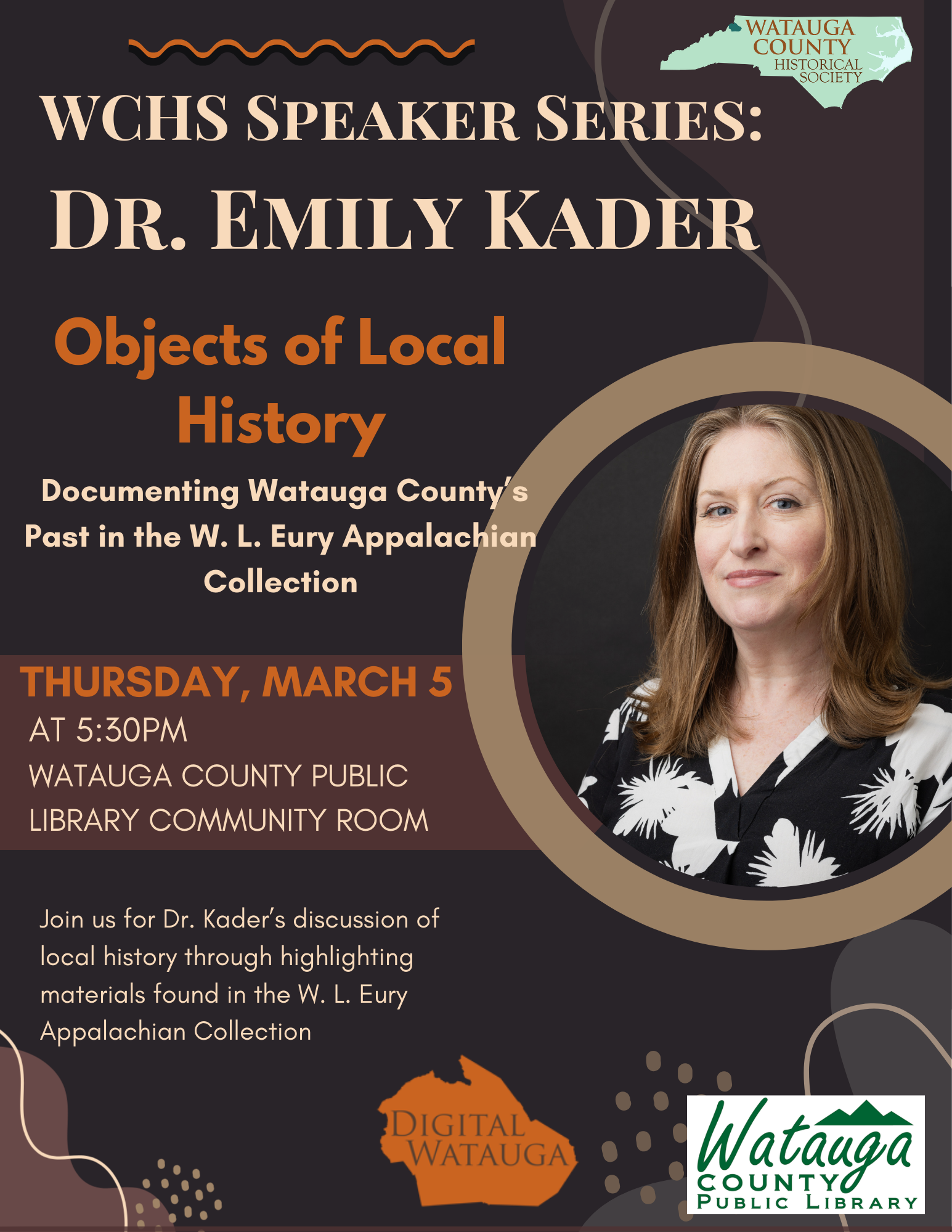 Join us in person as Anne Belk Distinguished Professor and Curator for Distinctive Collections at Appalachian State, Dr. Emily Kader, discusses the curatorial process of documenting Watauga County’s past through the W. L. Eury Appalachian Collection.
